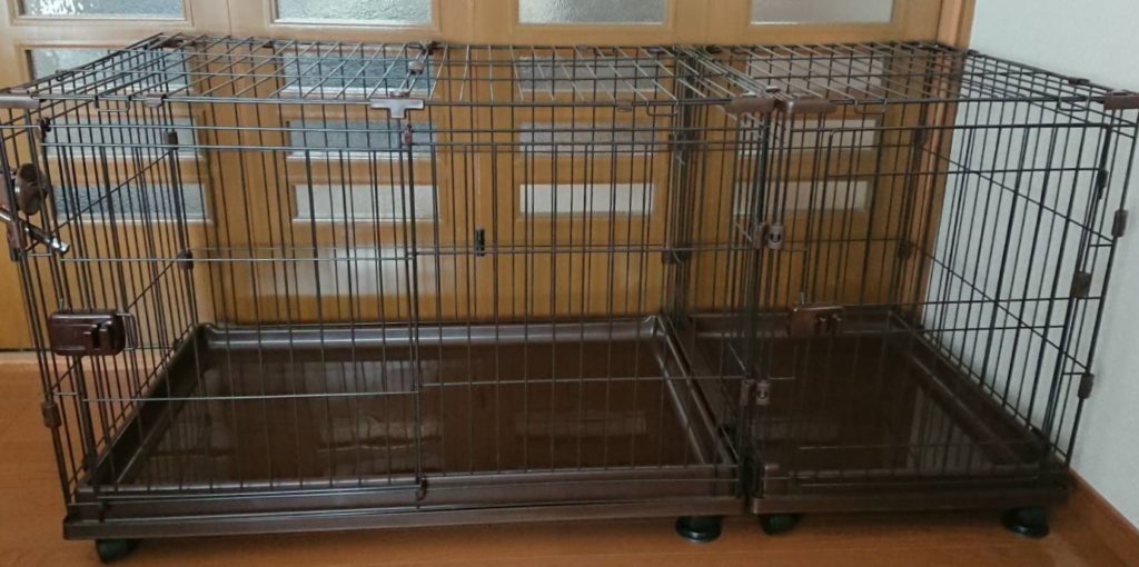 ケージは必要だと思います。「犬の祖先は穴ぐらで暮らしていたので狭いところを好む」と言われている様に、ケージを利用して、犬の落ち着く適度なサイズのスペースを確保してあげてください。我が家では拡張性があって、トイレ用のスペースと別れている、このアイリスオーヤマのケージを使っています。この写真の仕様は、コンビネーションサークルわんこ向けトイレトレーニングセットに、屋根(大)と屋根(小)の二つのパーツを組み合わせたものです。