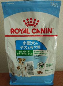 犬の妊娠期から出産後の子犬用には「ロイヤルカナン ミニスターター マザー&ベビードッグ」を与えています。こちらはグレインフリーではないですが、妊娠中に必要な葉酸も含んでくれています。こっちは更に小粒です。